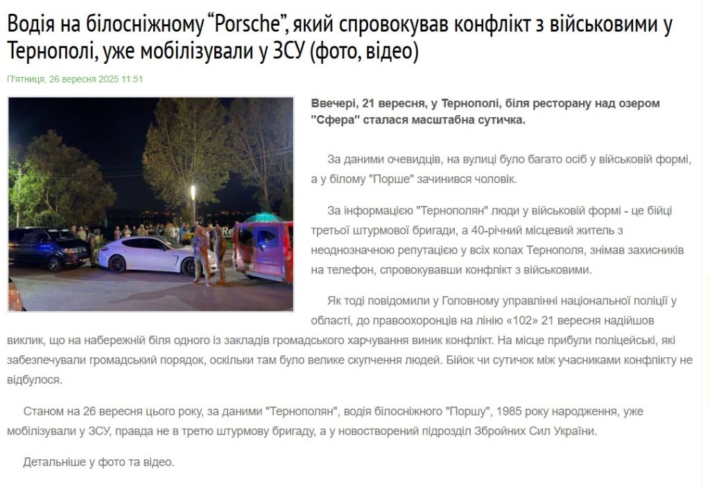 Станом на 26 вересня цього року, за даними “Тернополян”, водія білосніжного “Поршу”, 1985 року народження, уже мобілізували у ЗСУ, правда не в третю штурмову бригаду, а у новостворений підрозділ Збройних Сил України.