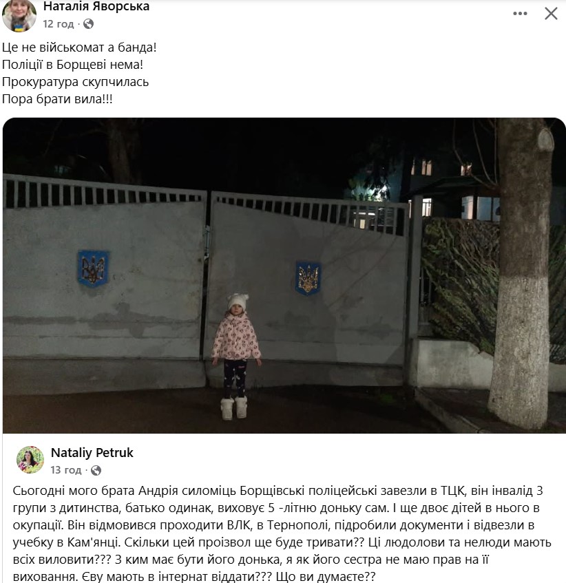 “Сьогодні мого брата Андрія силоміць Борщівські поліцейські завезли в ТЦК, він інвалід 3 групи з дитинства, батько одинак, виховує 5 -літню доньку сам. І ще двоє дітей в нього в окупації. Він відмовився проходити ВЛК, в Тернополі, підробили документи і відвезли в учебку в Кам’янці. Скільки цей проізвол ще буде тривати?? Ці людолови та нелюди мають всіх виловити??? З ким має бути його донька, я як його сестра не маю прав на її виховання. Єву мають в інтернат віддати??? Що ви думаєте??”