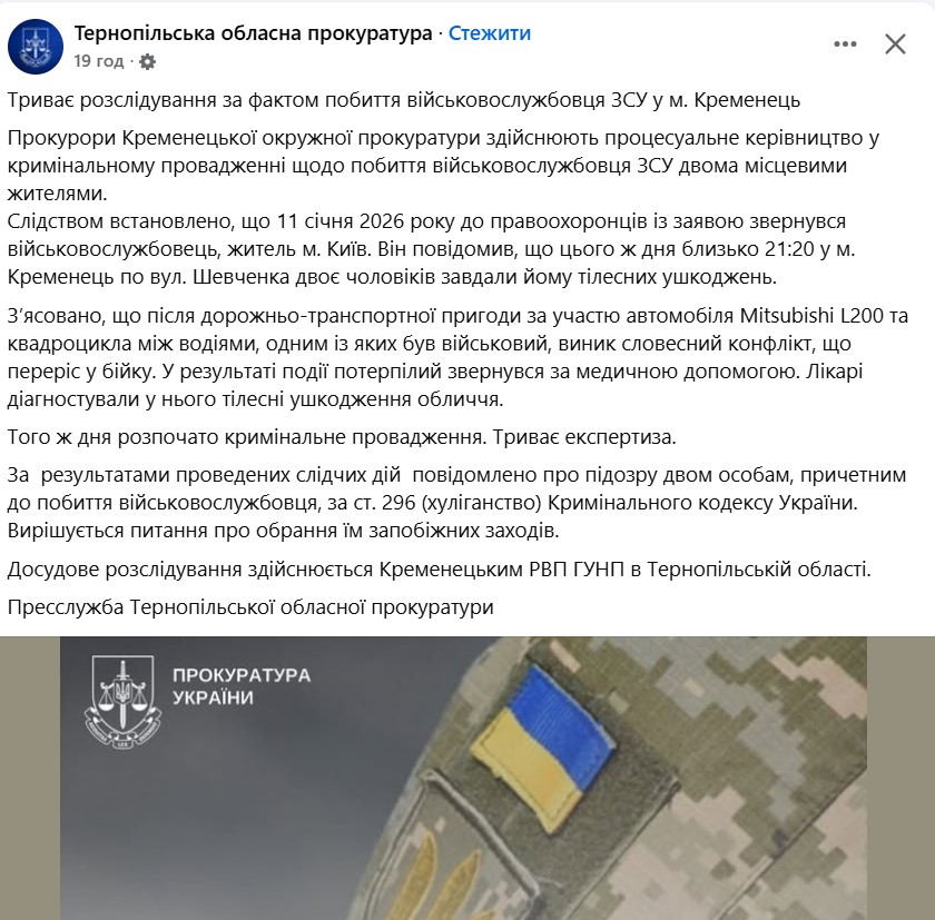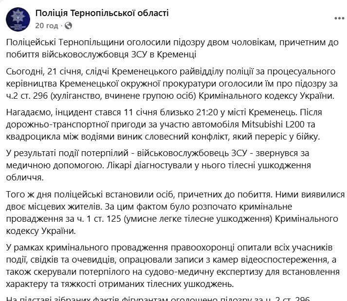 “Кременецьким мажорчикам”, які побили військового, повторимося – військового, поліцейські оголосили підозру за статтею за хуліганство і “легкі тілесні”