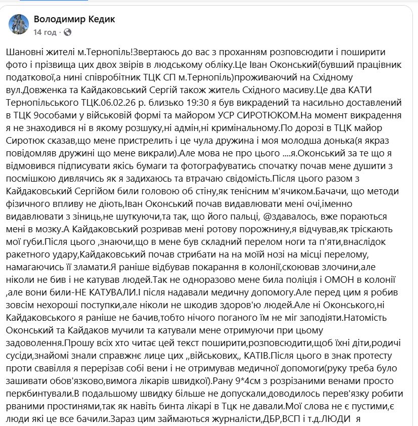 “Шановні жителі м.Тернопіль!Звертаюсь до вас з проханням розповсюдити і поширити фото і прізвища цих двох звірів в людському обліку.Це Іван Оконський(бувший працівник податкової,а нині співробітник ТЦК СП м.Тернопіль)проживаючий на Східному вул.Довженка та Кайдаковський Сергій також житель Східного масиву.Це два КАТИ Тернопільського ТЦК.06.02.26 р. близько 19:30 я був викрадений та насильно доставлений в ТЦК 9особами у військовій формі та майором УСР СИРОТЮКОМ.На момент викрадення я не знаходився ні в якому розшуку,ні адмін,ні кримінальному.По дорозі в ТЦК майор Сиротюк сказав,що мене пристрелить і це чула дружина і моя молодша донька(я якраз повідомляв дружині що мене викрали).Але мова не про цього ….я.Оконський за те що я відмовився підписувати якісь бумаги та фотографуватись спочатку почав мене душити з посмішкою дивлячись як я задихаюсь та втрачаю свідомість.Після цього разом з Кайдаковський Сергійом били головою об стіну,як тенісним м’ячиком.Бачачи, що методи фізичного впливу не діють,Іван Оконський почав видавлювати мені очі,іменно видавлювати з зіниць,не шуткуючи,та так, що його пальці, @здавалось, вже пораються мені в мозку.А Кайдаковський розривав мені ротову порожнину,я відчував,як тріскають мої губи.Після цього ,знаючи,що в мене був складний перелом ноги та п’яти,внаслідок ракетного удару,Кайдаковський почав стрибати на на моїй нозі на місці перелому, намагаючись її зламати.Я раніше відбував покарання в колонії,скоював злочини,але ніколи не бив і не катував людей.Так не одноразово мене била поліція і ОМОН в колонії ,але вони били-НЕ КАТУВАЛИ.І після надавали медичну допомогу.Але перед цим я робив зовсім нехороші поступки,але ніколи не шкодив здоров’ю людей.Але ні Оконського,ні Кайдаковського я раніше не бачив,тобто нічого поганого їм не міг заподіяти.Натомість Оконський та Кайдаков мучили та катували мене отримуючи при цьому задоволення.Прошу всіх хто читає цей текст поширити,розповсюдити,щоб їхні діти,родичі сусіди,знайомі знали справжнє лице цих ,,військових,, КАТІВ.Після цього в знак протесту проти свавілля я перерізав собі вени і не отримував медичної допомоги(руку треба було зашивати обов’язково,вимога лікарів швидкої).Рану 9*4см з розрізаними венами просто перкбинтували.В подальшому швидку більше не допускали,доводилось перев’язку робити рваними простинями,так як навіть бинта лікарі в Тцк не давали.Мої слова не є пустими,є люди які це все бачили.Зараз цим займаються журналісти,ДБР,ВСП і т.д.ЛЮДИ я перетерпів цю катівню і прошу не за себе.Прошу розголосу,що вашим рідним і близьким людям не довелось пережити похожі тортури від цих двох КАТІВ,по іншому їх назвати не можу.Такого не повинно повторитись.Українці мучать українців.Щиро дякую всім хто дочитав та поширив.ПОТРІБНО ЗУПИНИТИ ЦЕ НАСИЛЬСТВО НАД ЛЮДЬМИ!!!