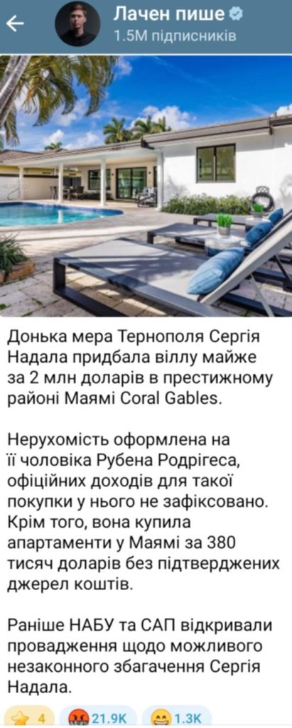 “Йой! В міській раді Тернополя запевняють, що на Сергія Надала, як мера українського міста, вчинили … дороговартісну бот-атаку, розповсюдивши розслідування про доньку мера.