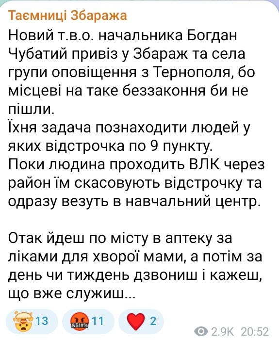 Паблік зі Збаража повідомляє, що з приходом нового начальника в Збаразьке ТЦК, Богдана Чубатого, той привіз з собою “чужих оповіщувачів”, бо “свої”, місцеві, не погодилися йти на повне беззаконня, яке їм наказують творити!