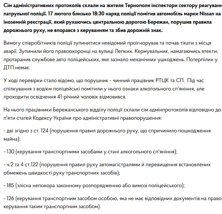 Скрін офіційного повідомлення з переліком статей ККУ нижче.